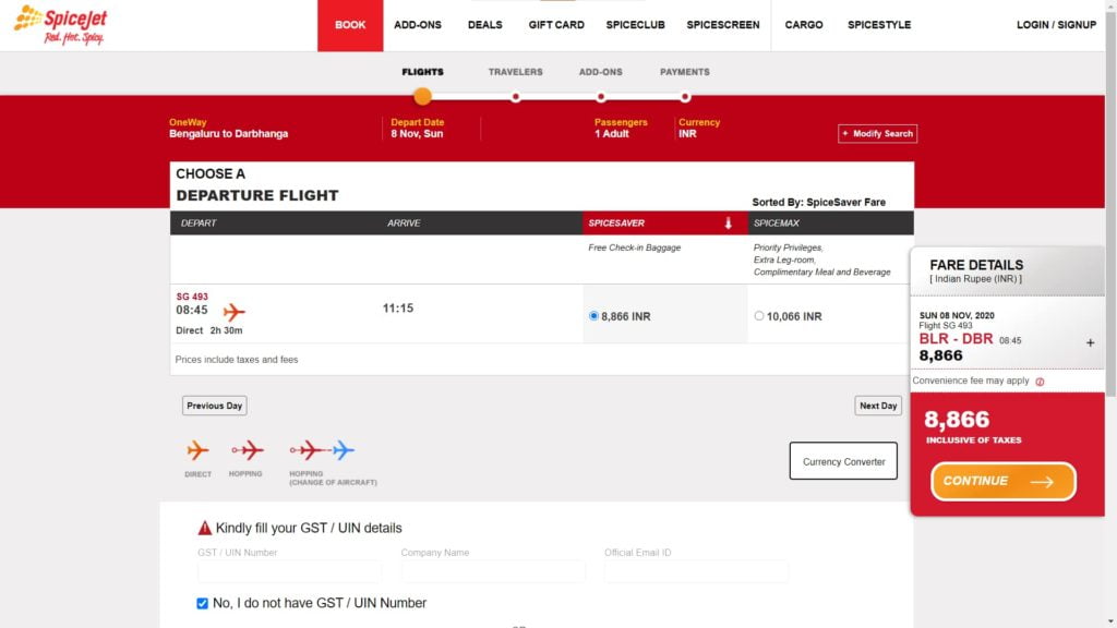 Once you fill out these details, you can choose the travel package in between the Spicesaver and Spicemax. The first one gives you only the free check-in baggage while the later one gives you Priority Privileges, Extra Leg-room, Complimentary Meal and Beverage. Definitely, the price of both the packages varies. It’s up to you which one you choose.